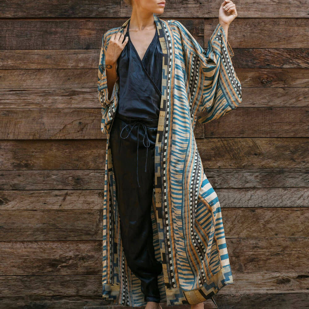 Bohème-Trends mit geometrischen Mustern! Das Cover-up im brasilianischen Stil hat eine offene Vorderseite mit einem Bindegürtel in der Taille für eine individuelle Passform. Lange Ärmel mit breiten Manschetten und Maxilänge.