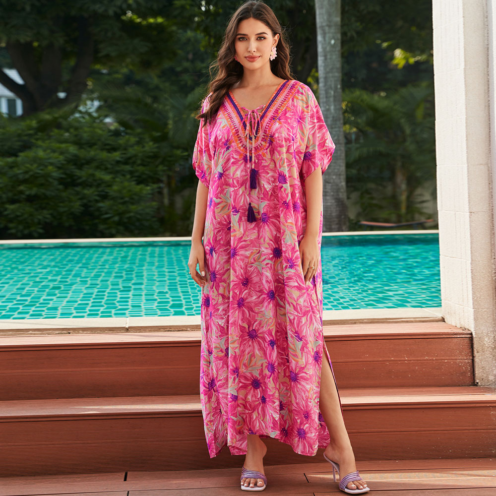 Lassen Sie Ihrem inneren Freigeist freien Lauf mit unserem luftigen Blumenüberwurf. Dieser lässige und doch schicke Überwurf besticht durch einen bezaubernden Blumendruck und einen trendigen V-Ausschnitt mit Schnürung und Quastenenden. Er verleiht Ihrem Strandoutfit einen Hauch von Bohème-Flair. Die kurzen Ärmel bieten genau das richtige Maß an Schutz, während das geteilte Design Atmungsaktivität und Bewegungsfreiheit verbessert. Sie fahren in den Urlaub? Vergessen Sie nicht, dieses vielseitige Kleidungsstück für einen lässigen Strandlook einzupacken.