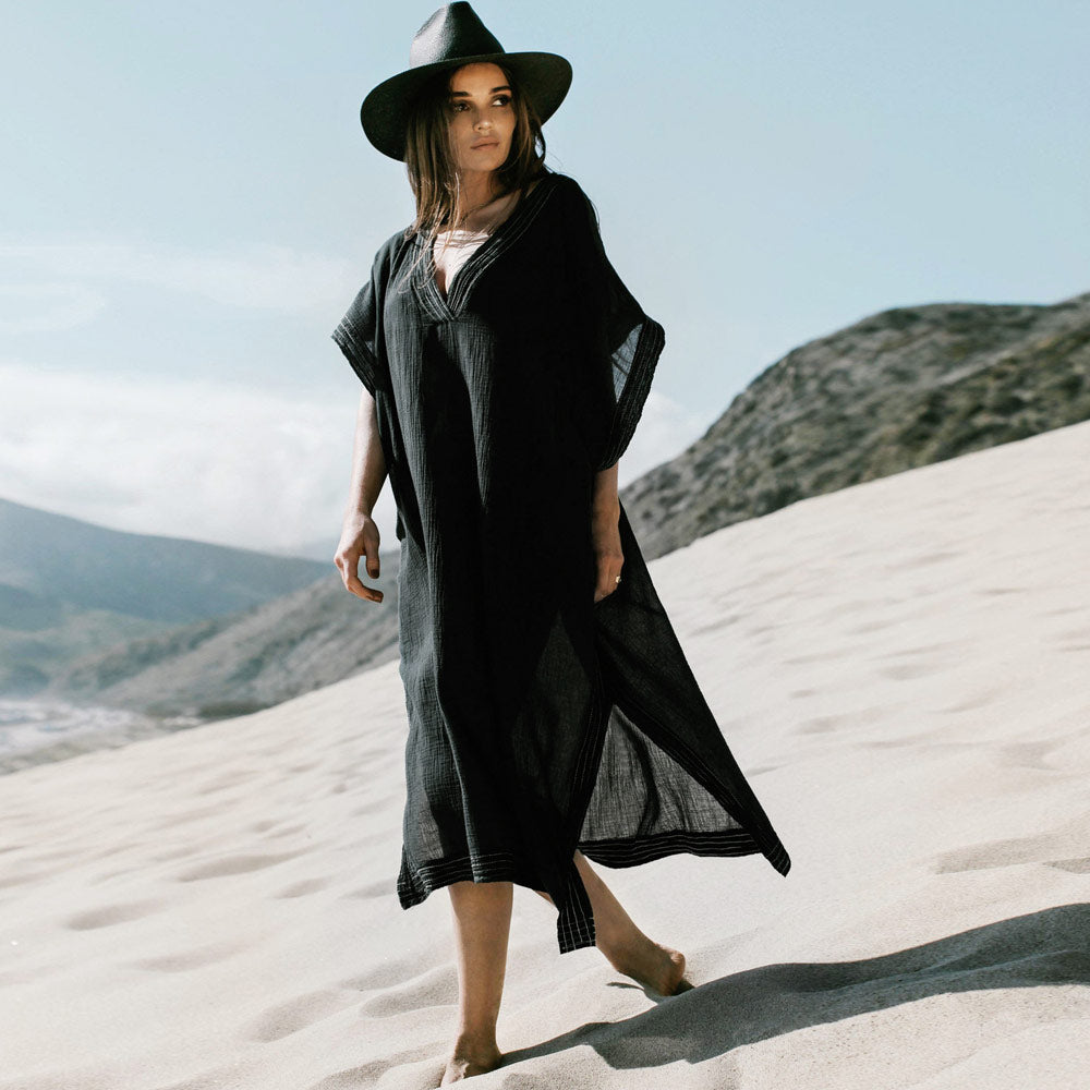 Vervollständige deinen Strandlook mit diesem lässigen Outfit. Kombiniere deine Lieblings-Sandalen und einen passenden Strohhut. Das brasilianische Cover-up hat einen tiefen V-Ausschnitt mit weißen Ziernähten, Fledermausärmel mit ausgestellten Bündchen und eine formlose Silhouette mit Seitenschlitzen und einer Länge bis zur Wadenmitte.