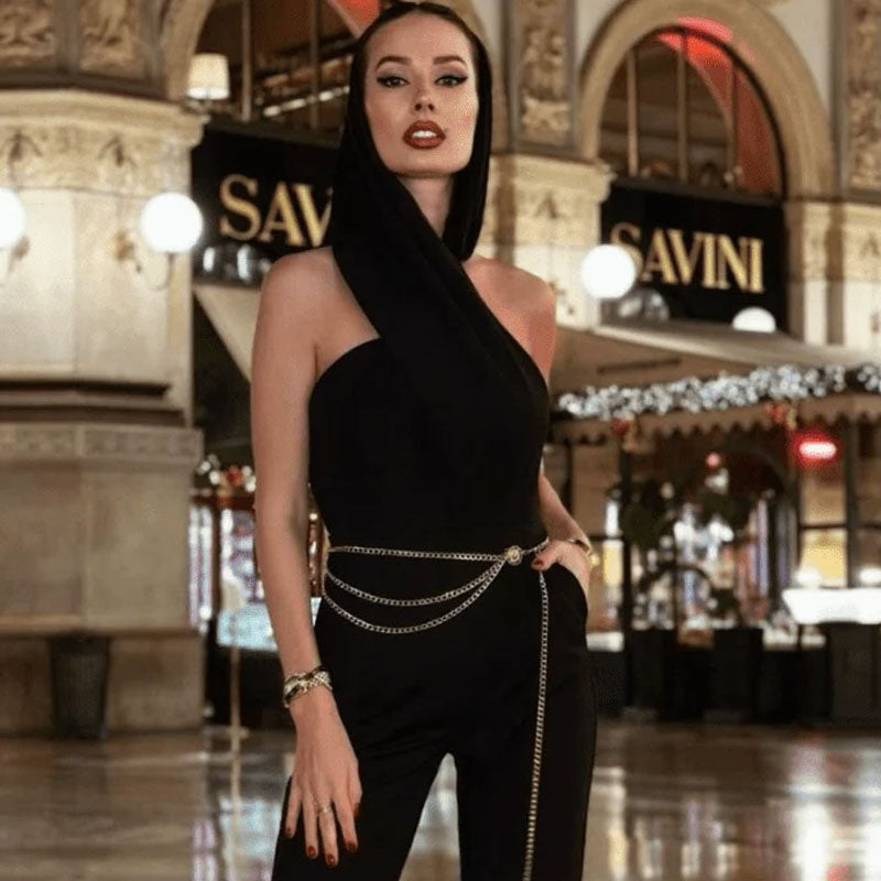 Ein topaktueller ärmelloser Jumpsuit strahlt eleganten Stil aus. Mit seinem gekreuzten Design vorne und dem offenen Rücken hebt dieser schwarze Designer-Jumpsuit Mode auf ein neues Level. Die hohe Taille, kombiniert mit praktischen Seitentaschen, bietet Funktionalität und trendigen Look. Doch damit nicht genug: Der ausgestellte Saum verleiht ihm einen Hauch von Eleganz, während die Kapuze für einen modernen Touch sorgt. Dieser Jumpsuit mit Kapuze verkörpert Modernität und Eleganz und ist damit ein ultra-modisches Outfit für unterwegs.