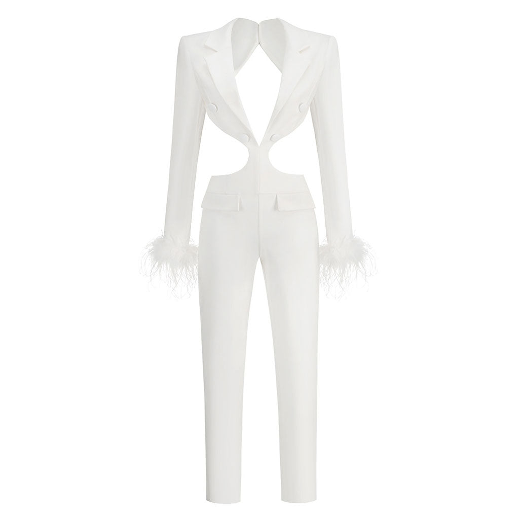 Dieser sexy Blazer-Jumpsuit strahlt unvergleichliche Eleganz und Kühnheit aus. Er besticht durch einen kantigen Reverskragen, sorgfältig gefertigte Schulterpolster und verführerische Cut-Outs an der Taille. Er ist mit exquisiten Knopfakzenten und einem künstlichen Klappenbesatz verziert. Der luxuriöse Federbesatz an den Manschetten ziert den Jumpsuit zusätzlich. Die elegant langen Ärmel verleihen dem Ensemble einen Hauch von Raffinesse, während der gewagte offene Rücken einen verlockenden Reiz verleiht. Der stylische Designer-Jumpsuit lässt sich mühelos mit Knöpfen und einem verdeckten Reißverschluss auf der Rückseite schließen und sorgt so für eine nahtlose Passform.