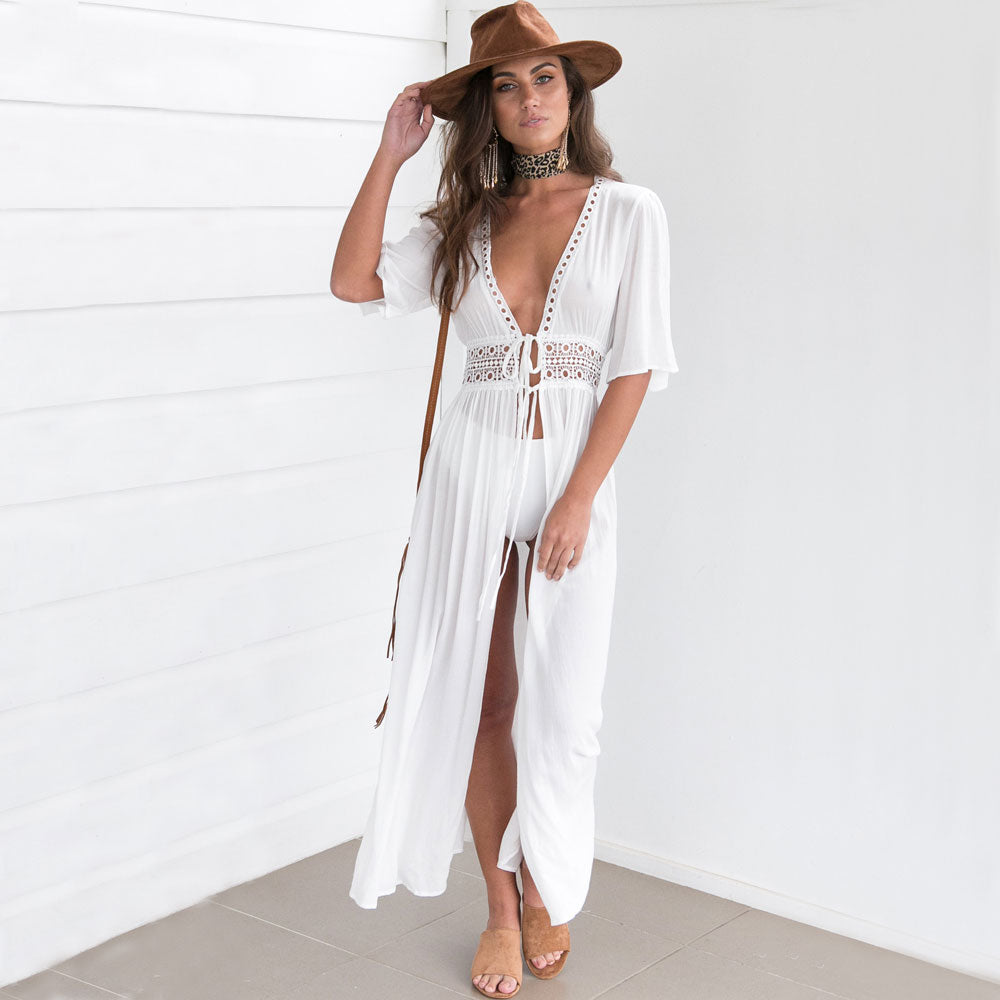 Machen Sie dieses Chiffon-Überkleid im brasilianischen Stil zu Ihrem Must-have für die neue Saison. Das Überkleid besticht durch seine Chiffon-Textur mit Häkeleinsätzen, ausgestellten Ärmeln, einem Bindeverschluss vorne und Maxilänge.