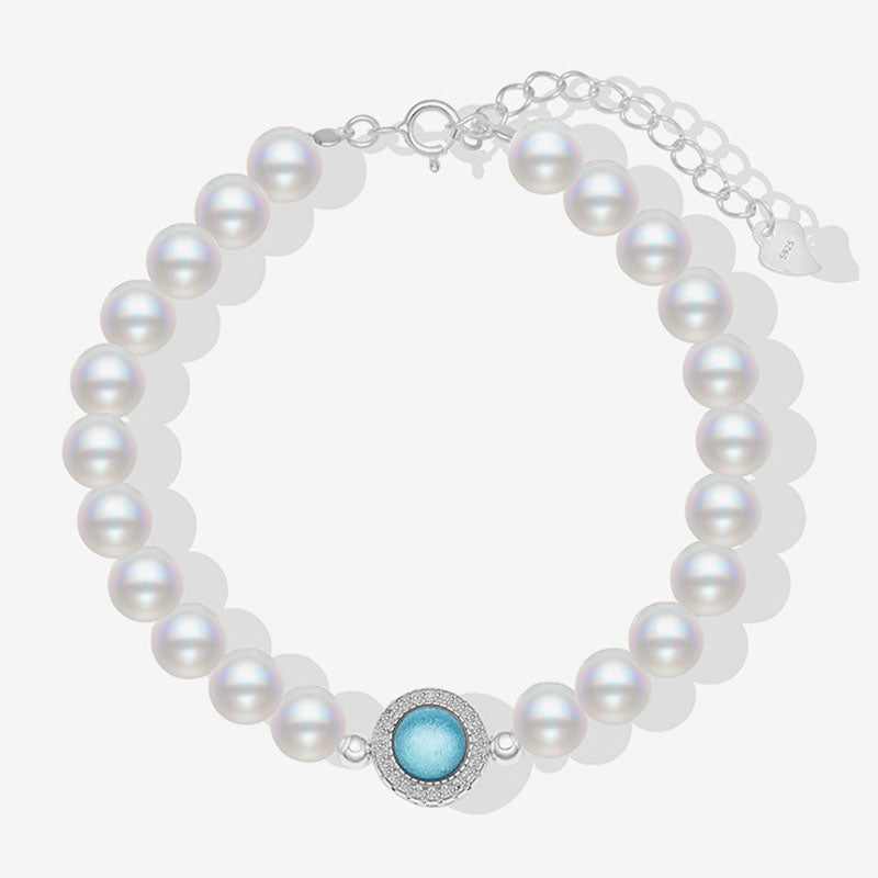 Dieses wunderschöne Designer-Armband aus Sterlingsilber präsentiert einen Aquamarinkristall, umgeben von funkelnden kleinen Edelsteinen, eingebettet zwischen glänzenden Süßwasserperlen. Das zarte Perlenarmband ist am Verschluss mit einem herzförmigen Anhänger verziert, der Glück und Reichtum symbolisiert.