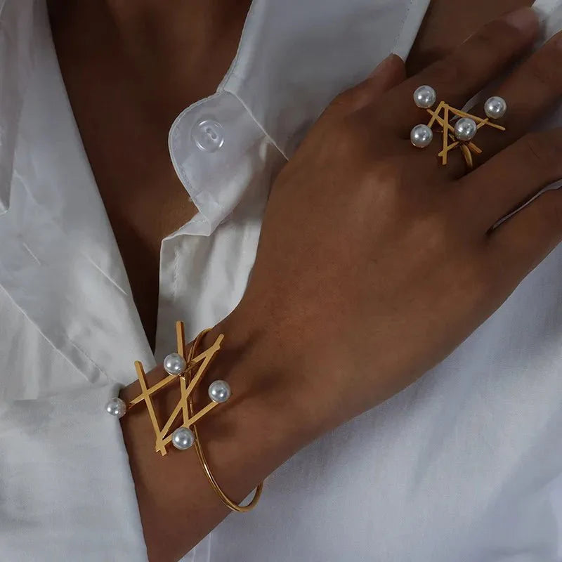 Setzen Sie ein Statement mit persönlicher Eleganz. Veredeln Sie Ihren Stil und fangen Sie die Essenz der Raffinesse mit unserem Set aus Armband und Ring mit geometrischer Barockperle ein. Bestellen Sie noch heute!