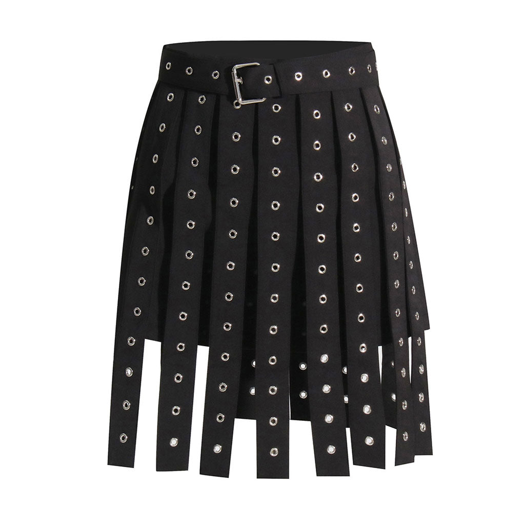 Das Pop-Punk-Revival ist ungebrochen. Mit diesem Designer-Faltenrock mit Ösenbesatz liegen Sie voll im Trend. Erhältlich in Schwarz. Der Fransen-Minirock präsentiert sich im schicken Riemchen-Stil mit metallischen Ösendetails für einen Hauch Punk-Flair. Ein Schnallengürtel sorgt für sicheren Halt. Der rebellische Kurzrock passt perfekt zu Ihren klobigen Stiefeln. Ein schlichtes T-Shirt, hineingesteckt, verleiht Ihnen eine starke Persönlichkeit.
