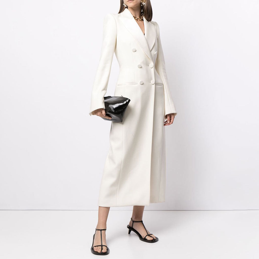 Tauschen Sie Ihr klassisches Weiß aus. Reines Weiß in seiner Essenz. Dieser Designer-Blazer verkörpert Raffinesse. Mit seinem klassischen Charme, dem Reverskragen und den langen Ärmeln unterstreicht er seinen zeitlosen Charme. Die taillierte Passform sorgt für eine schmeichelhafte Silhouette, während die Knopfleisten und Seitentaschen ihm eine moderne Note verleihen. Der Schlitz auf der Rückseite verleiht diesem eleganten Trenchcoat Funktionalität und Stil. Dieses Stück verkörpert zeitlose Eleganz und ist ein Markenzeichen für leichte Luxusmode. Kombinieren Sie ihn perfekt mit Stilettos und Stiefeln mit Absatz.
