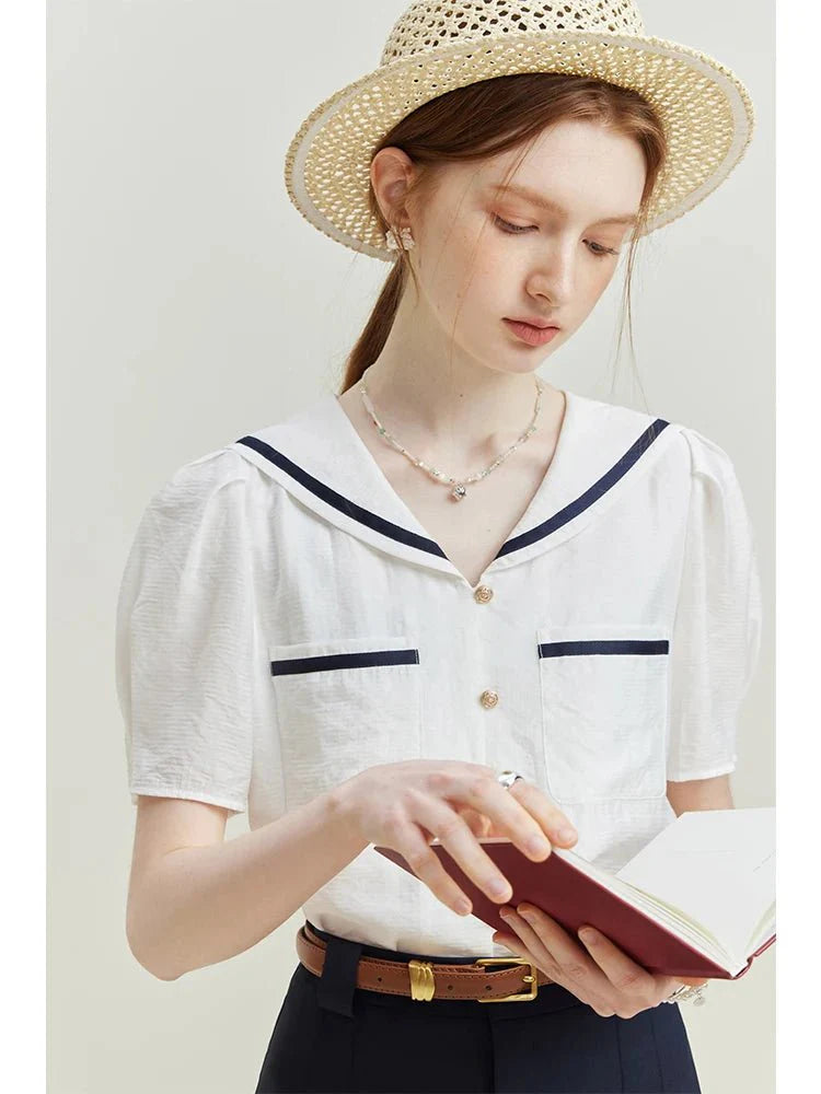 Verleihen Sie Ihrer Sommergarderobe zeitlose Eleganz mit unserem schlichten, kurzärmeligen Hemd mit marineblauem Kragen. Dieses lässige Oberteil ist der Inbegriff von schicker Schlichtheit und Komfort. Speziell für die modebewusste, moderne Frau entworfen.