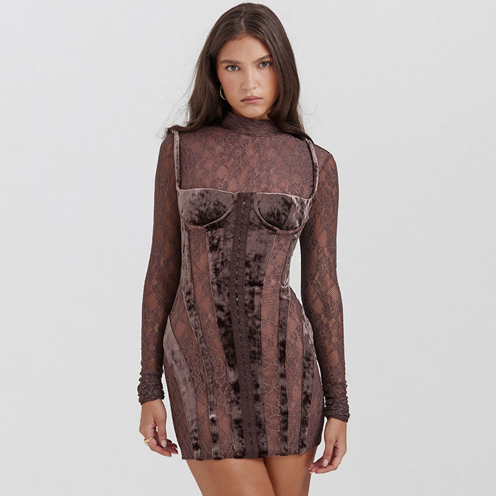 Eine Farbpalette in Ton und Ton, kombiniert mit zwei unterschiedlichen Stoffen, setzt den ultimativen Akzent in der Modewelt – dieses figurbetonte Minikleid in Vintage-Braun ist der Beweis dafür. Dieses exquisite Designer-Langarmkleid besticht durch einen Stehkragen und transparente lange Ärmel. Betonen Sie Ihre Kurven selbstbewusst in diesem verführerischen Korsett-Minikleid. Die schmale Passform betont Ihre Silhouette perfekt. Mit Schlaufenknöpfen und einem dezenten Reißverschluss hinten mit Schlüssellochausschnitt vereint dieses Kleid Vintage-Charme mit modernem Charme.