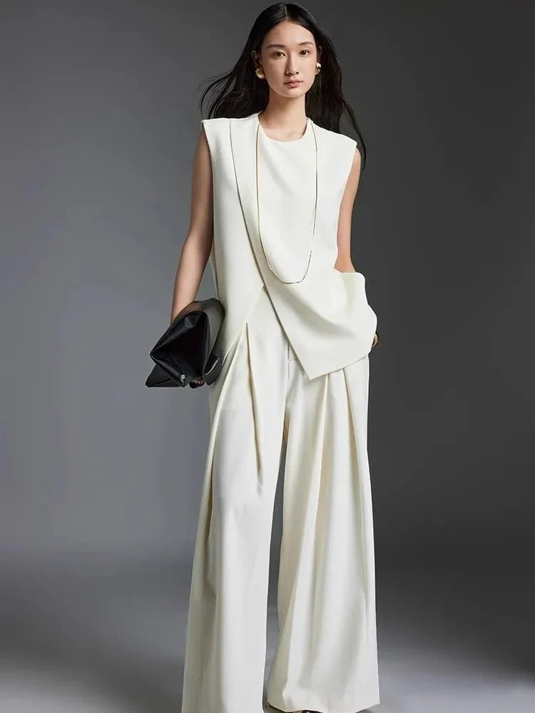 Veredeln Sie Ihre Sommergarderobe mit unserem cremefarbenen Anzugwesten-Set mit weitem Bein für Damen. Dieses stilvolle zweiteilige Set besteht aus einer unregelmäßig geschnittenen Weste mit Schlitz und einer eleganten Hose mit weitem Bein. Perfekt für legere und formelle Anlässe. Die Weste verleiht mit ihrem einzigartigen Design einen Hauch von Eleganz, während die Hose mit weitem Bein Komfort und Vielseitigkeit bietet. Hergestellt aus hochwertigem Stoff, ist dieses Set ein Must-have für Ihre Sommergarderobe.