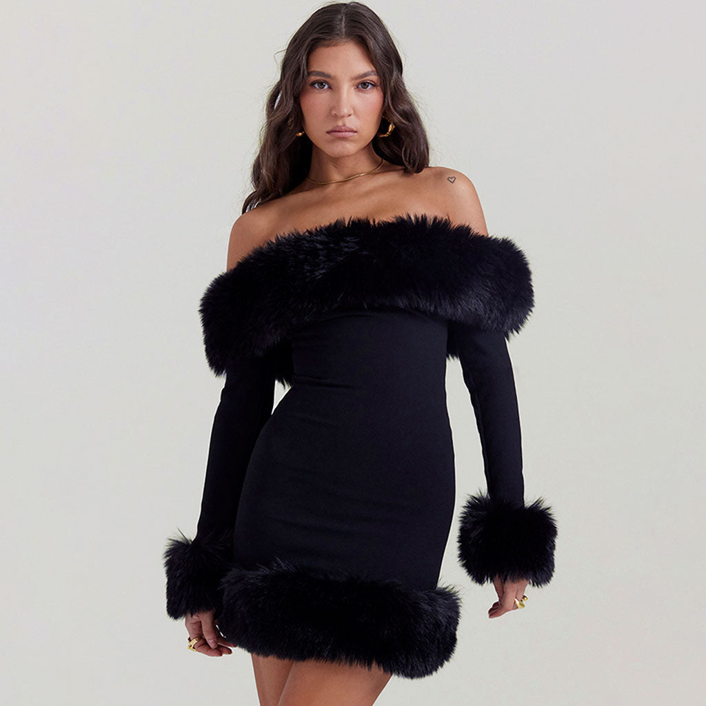 Im Bereich der dezenten Luxusmode ist dieses flauschige kleine Schwarze der Inbegriff luxuriöser Eleganz. Tauchen Sie ein in den plüschigen Kunstpelzbesatz, der Schultern, Bündchen und Saum elegant ziert und dem figurbetonten Stretchstoff glamouröse Wärme verleiht. Mit seinem kurzen Saum, dem dezent platzierten Reißverschluss hinten und der tadellos sitzenden Silhouette strahlt es raffinierte Eleganz aus, ergänzt durch die Anmut der langen Ärmel. Dieses sexy schulterfreie Minikleid verkörpert mühelos raffinierte Extravaganz.