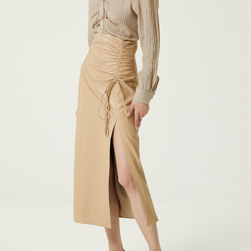 Eleganter Midirock aus veganem Leder mit Kordelzug, hoher Taille und Schlitz vorne - Khaki