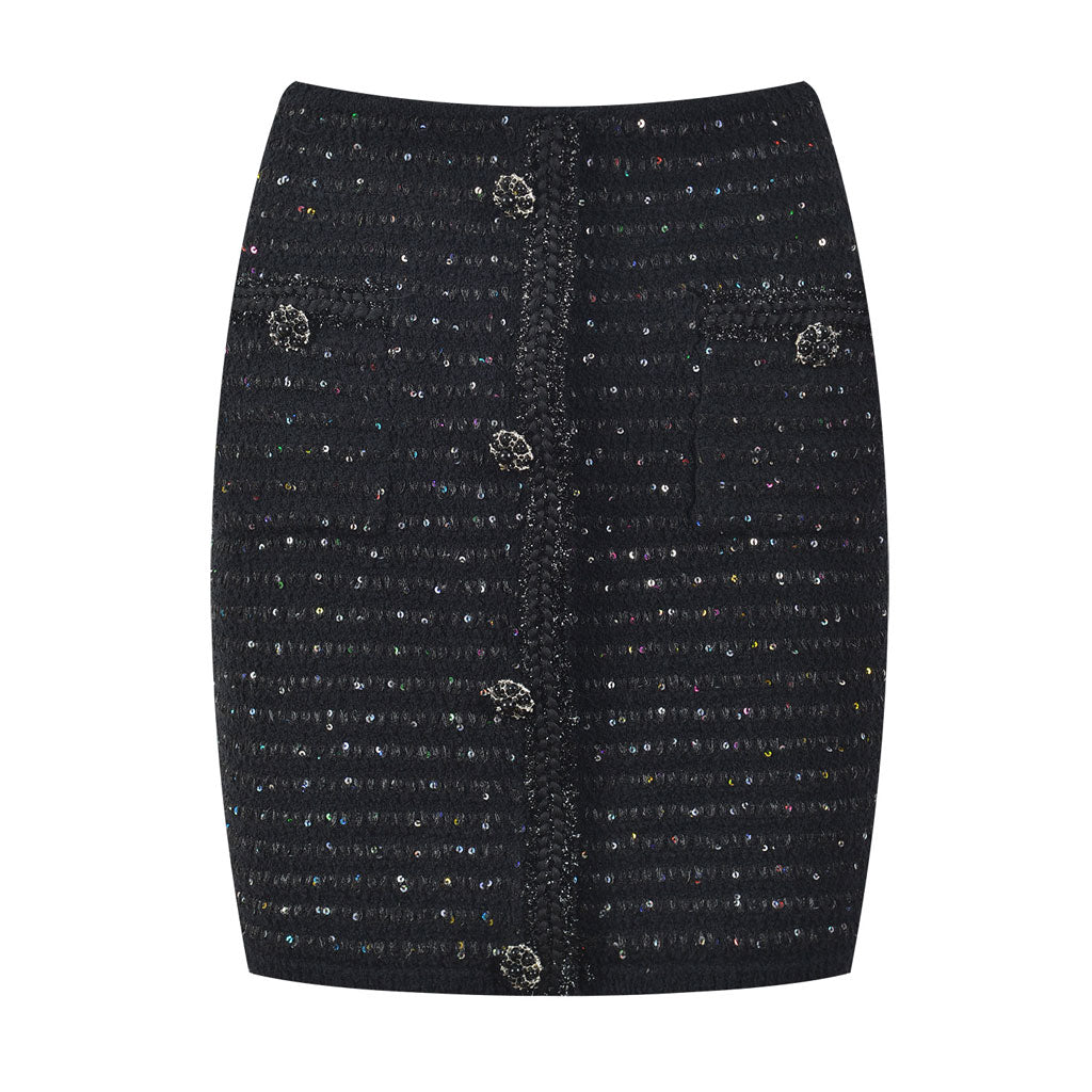 Mit diesem schimmernden, taillierten Minirock aus einer frechen Acryl-Baumwoll-Mischung zeigen Sie sich stilvoll. Das hoch taillierte Design, akzentuiert mit funkelnden Kristallknöpfen, betont Ihre Figur an den richtigen Stellen. Die zwei aufgesetzten Taschen verleihen dem Glanz einen praktischen Touch. Dieser schwarze Designer-Strickrock mit seinen bunten Pailletten ist ein echter Hingucker. Perfekt für alle, die gerne funkeln und schwingen. Egal ob Sie auf der Tanzfläche sind oder einfach Ihren Tag aufpeppen möchten – dieser Rock ist genau das Richtige für ein bisschen Glanz und Glamour. Kombinieren Sie ihn außerdem mit unserer farbenfrohen Pailletten-Strickjacke für das ultimative Strick-Duo.