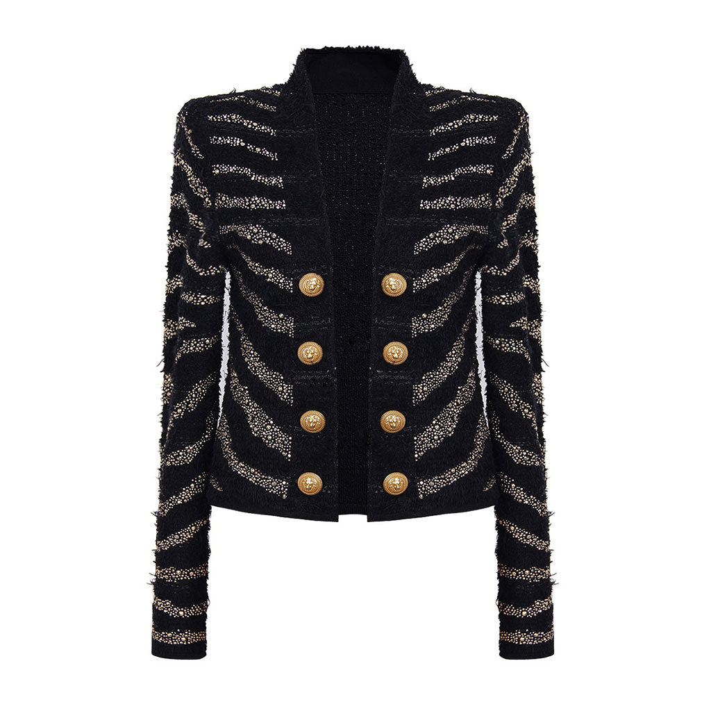 Faszinierende Kontraste! Hüllen Sie sich in zeitlose Eleganz mit unserer schimmernden Designer-Tweed-Strickjacke. Die offene Knopfleiste mit goldfarbenen Prägeknöpfen verleiht einen Hauch von Raffinesse. Das Zebramuster mit kontrastfarbenen Strasssteinen und Nieten hebt sich hervor und präsentiert eine perfekte Mischung aus Trendy und Luxus. Mit ihren langen Ärmeln strahlt diese Strickjacke Raffinesse aus. Perfekt, um jedem Outfit einen Hauch von Klasse zu verleihen. Dieses Kleidungsstück eignet sich ideal für gehobene Events oder stilvolle Abende. Kombinieren Sie es mühelos mit unserem luxuriösen Tweed-Stricktop und -Rock !