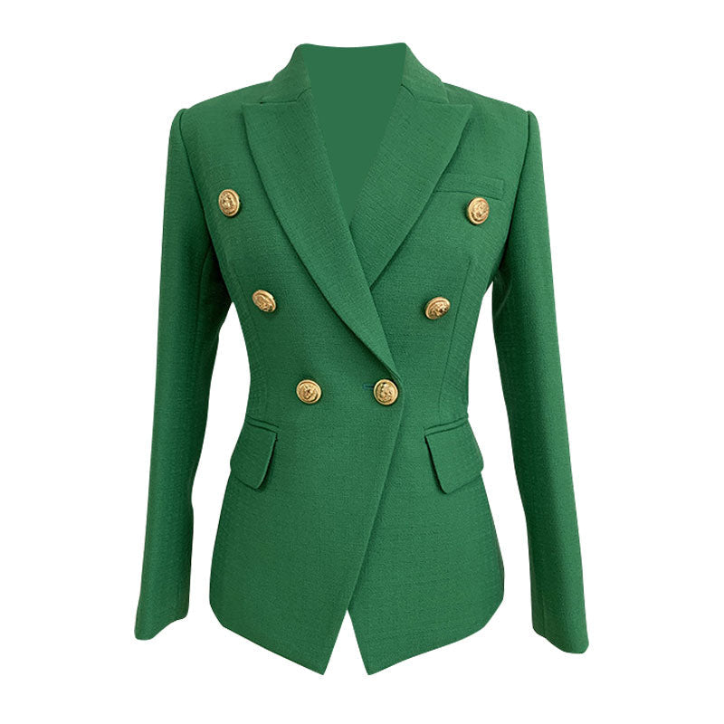 Es ist Zeit, sich mit unserem Leinenblazer zu verwöhnen. Ein leuchtender Grünton, der Ihre Garderobe garantiert aufpeppt. Dieser zweireihige Blazer hat stark gepolsterte Schultern, lange Ärmel und Pattentaschen vorne. Das goldfarbene Knopfdesign ziert die Vorderseite und die Manschetten und sorgt für einen luxuriösen Retro-Look. Die Abnäher in der Taille sorgen für eine schlanke Passform und gehobenen Stil. Dieser Designer-Blazer vereint präzise Schnittführung und feminine Passform und eignet sich perfekt für Büro und Freizeit. Kombinieren Sie ihn mit der passenden Hose und Heels für die Arbeitszeit oder mit Jeans für den Wochenendspaß.