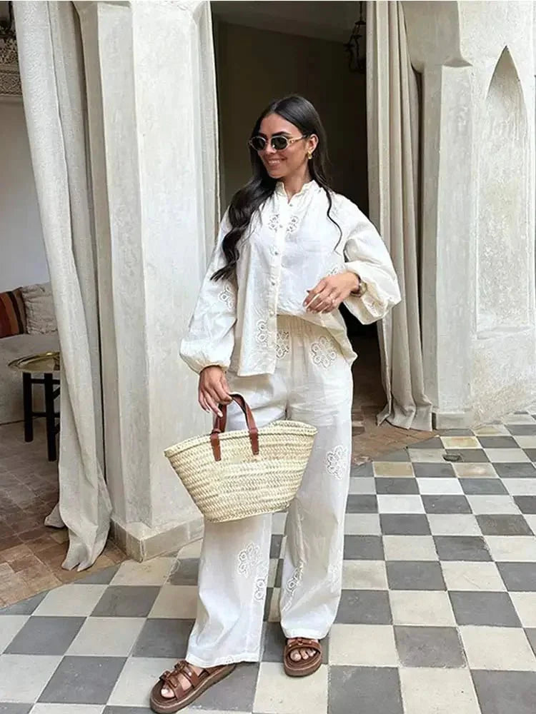 Veredeln Sie Ihr Streetwear-Outfit mit unseren zweiteiligen Sets mit weißen Blumenprint-Hosen. Dieses stylische Ensemble besteht aus einem langärmeligen Hemd mit Reversknopf und einer passenden Hose mit Hohlsaum. Der zarte Blumenprint verleiht dem Outfit einen Hauch von Weiblichkeit. Die lässige, lockere Passform sorgt für ganztägigen Tragekomfort. Das Streetwear-inspirierte Design verleiht Ihrem Look eine trendige Note. Perfekt für einen Tagesausflug oder legere Treffen. Dieses Set setzt garantiert überall ein Statement.