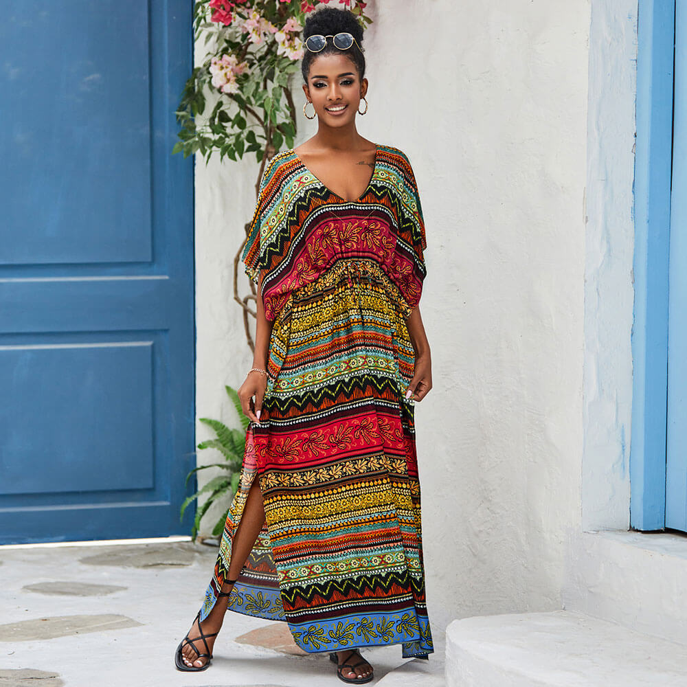 ¡Disfruta al máximo con este vibrante caftán étnico! Este vestido playero de verano rebosa personalidad. Luce sus mangas cortas con puños anchos, su coqueto escote pronunciado y sus divertidas aberturas laterales en el largo dobladillo. Todo con una silueta suelta y fluida, sujeta a la cintura. ¡Serás el alma de la fiesta! Realza tu estilo de baño con este cautivador y versátil vestido playero.