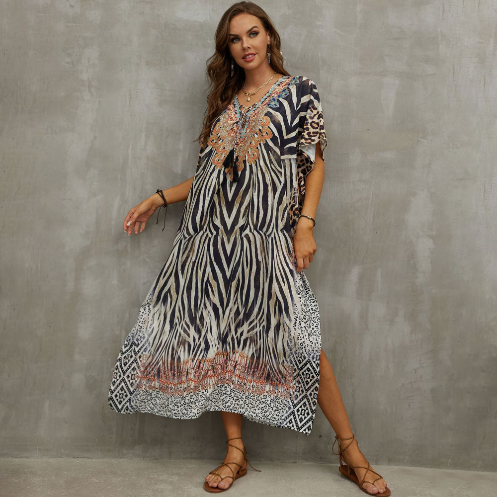¡Adéntrate en el paraíso bohemio con nuestro pareo estampado informal! Sumérgete en el encanto de las playas de verano con estilo gracias a sus mangas cortas, aberturas laterales y un favorecedor diseño de largo medio. Disponible en una gran variedad de colores y estampados, desde exóticos estampados de animales como leopardos, serpientes, cebras y tigres, hasta hermosos estampados florales. Este pareo extragrande sin duda causará sensación dondequiera que te lleven tus aventuras playeras.