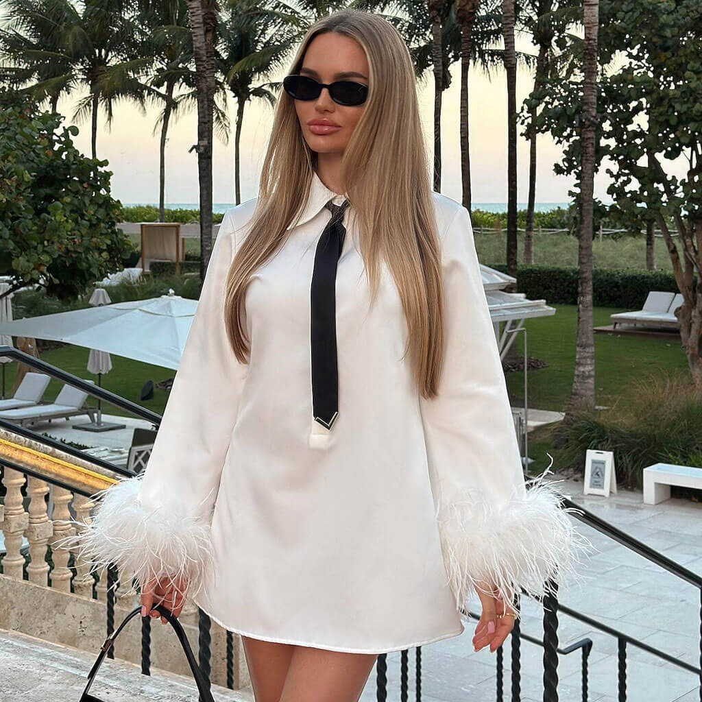 Este genial vestidito blanco es todo estilo camisero. ¡Casi como si fuera un juego de vestir propio! Este minivestido de diseñador logra ese aire preppy de alta gama, a la vez que se mantiene fresco con su corte fluido y evasé. Las mangas son un éxito rotundo, adornadas con ribetes de plumas sintéticas en los puños. Y fíjate en el cuello vuelto, que esconde sutilmente una elegante botonadura: ¡todo se trata de detalles sorpresa! Ah, ¿y adivina qué? Incluso viene con una corbata negra a juego. ¡Listo para salir! Confeccionado en tela impecable, este vestido corto causará sensación allá donde vayas.