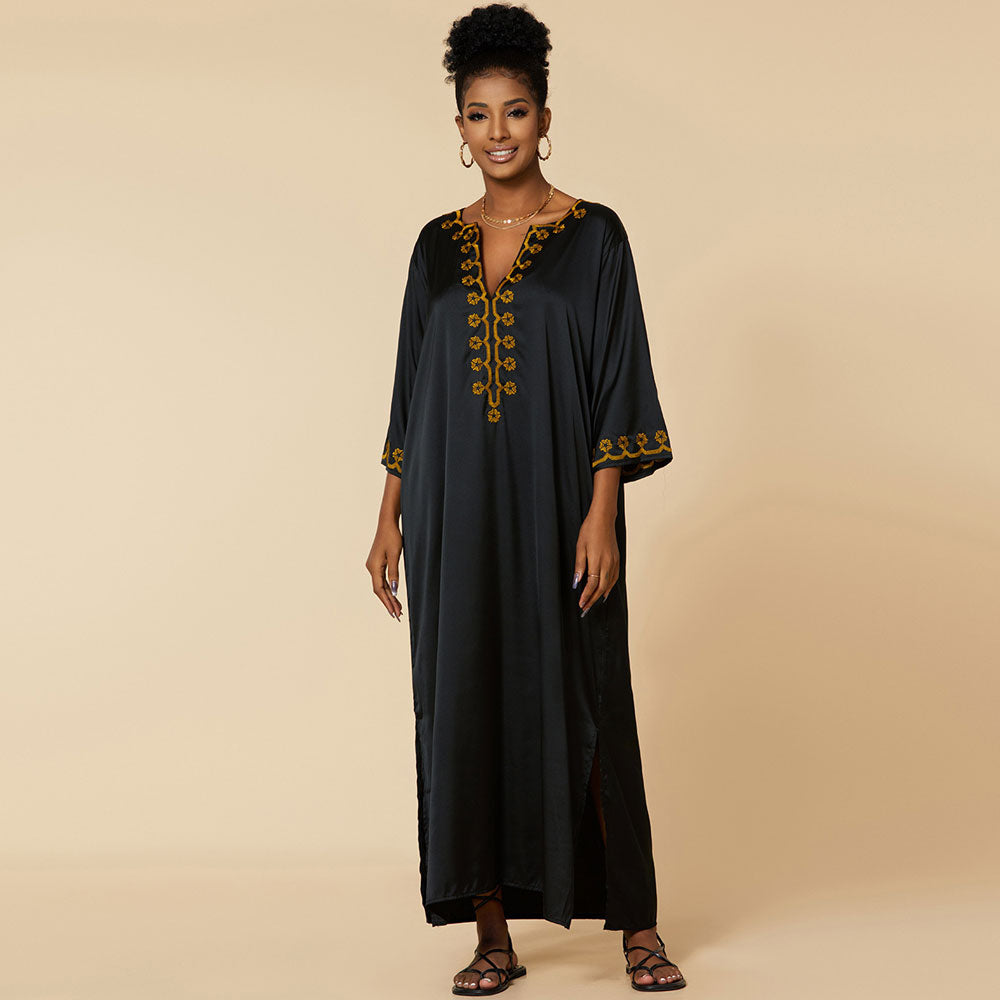 Luce tu elegancia playera con nuestro vestido playero étnico. Inspirado en culturas étnicas, esta exquisita pieza presenta intrincados bordados florales y mangas 3/4 sueltas. Su silueta oversize irradia sofisticación relajada. Perfecto para relajarse en la playa o disfrutar de un cóctel al atardecer. Ya sea que estés paseando por la costa o bailando bajo las estrellas, este vestido largo con abertura lateral combina comodidad y estilo para un look playero inolvidable.