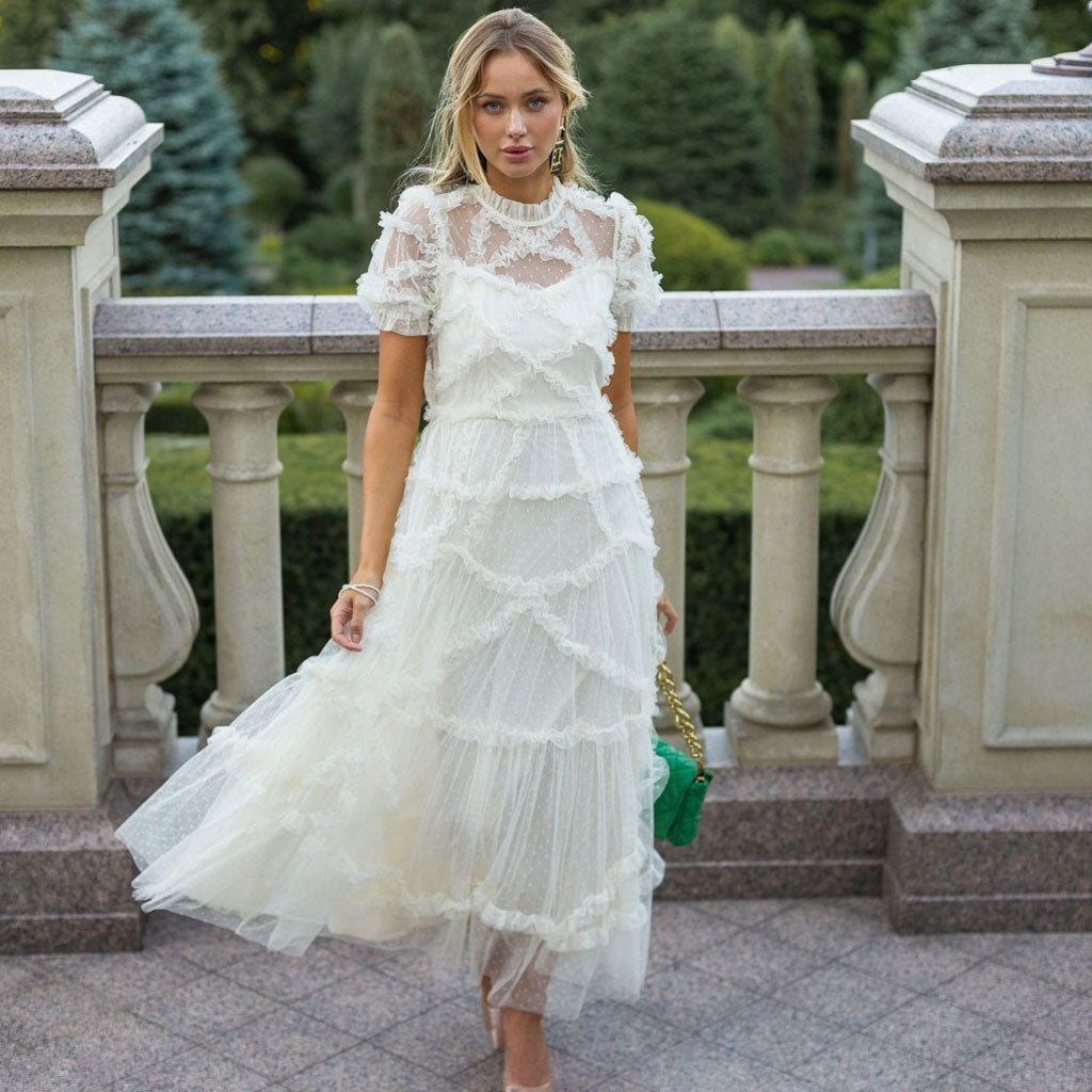 Este vestido de tul estilo francés Luxedress para primavera y verano es la prenda perfecta para tu gran día. De la colección de vestidos de cuento de hadas del diseñador, esta sensación de lunares brillantes es una maravilla. Con un corpiño parcialmente forrado y un coqueto cuello alto con volantes, una discreta cremallera trasera, mangas cortas transparentes y una falda amplia y a capas de corte A, se trata de un estilo fresco y elegante. Y aquí está la clave: ¡los volantes alegres en la suave silueta le añaden un toque extra de encanto! Disponible en azul, blanco o marfil, este vestido floral es como un soplo de aire fresco para tu día especial.