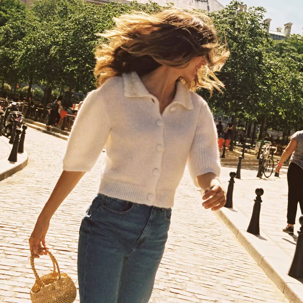 No hay nada más bonito que este suéter afelpado para abrigarse en otoño. Su suave tejido de mezcla de mohair es popular por su versatilidad y su equilibrio femenino. Nos encanta su bonito cuello con detalles de encaje blanco, y el cierre de botones redondeados le da un toque encantador. Las mangas ligeramente abullonadas le dan un toque voluminoso que transmite una sensación de calidez y un aire romántico. Tiene el largo justo hasta la cintura, perfecto para combinar con una variedad de prendas inferiores. Para un toque fresco y relajado, añade unos vaqueros rectos y unos mules de tacón.