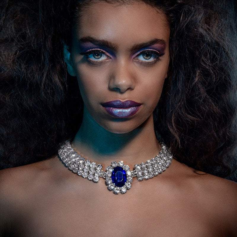 Exquisito y elegante. Este opulento collar se caracteriza por su elegancia atemporal y lujo clásico. Esta elegante pieza presenta una gema central de corte ovalado con superficie facetada. El zafiro artificial está enmarcado por un halo de cristal transparente, que añade brillo a tu look. Un trío de cadenas de diamantes de imitación adornan el collar con destellos que iluminan la piel. Su cierre de broche asegura un ajuste perfecto. Combina a la perfección con cualquier look elegante. Perfecto para realzar tu estilo. Sin duda, no pasará desapercibido.