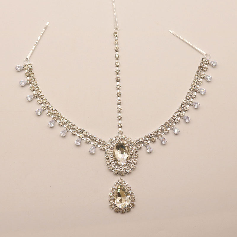Un adorno para la cabeza con un acabado de lujo. Elaborado con cristales blancos transparentes y brillo plateado. Un trío de cadenas se sujeta con tres pasadores para deslizarse en el cabello. La enorme gema está rodeada por diamantes de imitación y va seguida de una gema en forma de lágrima que enmarca el rostro. Las cadenas para la frente descansan suavemente desde los lados hacia el frente, con gotas brillantes que se balancean con tus movimientos. Llévala con rizos sueltos u ondas para un look romántico que te convertirá en el centro de atención.