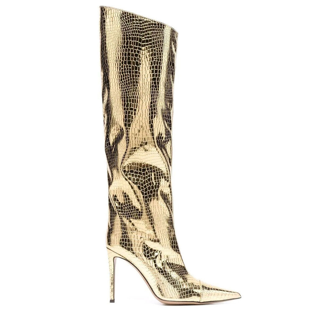 Jugar con la llamativa paleta de colores es la respuesta para romper con el aburrimiento de las estaciones. Inspirados en la purpurina holográfica, estos llamativos zapatos están completamente cubiertos con una decoración en relieve de serpiente que combina con una punta inclinada y tacones altos y finos de aproximadamente 12 cm. Hechos de piel sintética de primera calidad, mantienen una silueta estructurada y ancha para un corte ajustado. Las costuras en un tono tonal y ocultan un cierre de cremallera lateral los convierten en una pieza deslumbrante. Su estilo vanguardista sin duda captará la luz mientras te mueves. ¡Hazlos tuyos y luce con un minivestido de color liso!