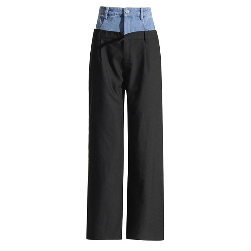 Marca tendencia con estos pantalones de cintura doble que redefinen el mundo de la moda. La dinámica separación entre los paneles negros y azules crea un atractivo estilo urbano. La cintura alta azul estiliza tus piernas, mientras que las trabillas en la sección negra le dan un toque extra de estilo. La parte superior azul tiene un sutil fruncido que acentúa el elegante diseño de cintura alta. La sección negra tiene una abertura recta que irradia una estética relajada y chic. Perfectos para cualquier ocasión. Estos pantalones que marcan tendencia son una verdadera manifestación de tu estilo. Te garantizamos que realzarán tu look y te harán destacar. ¡Son súper chic!