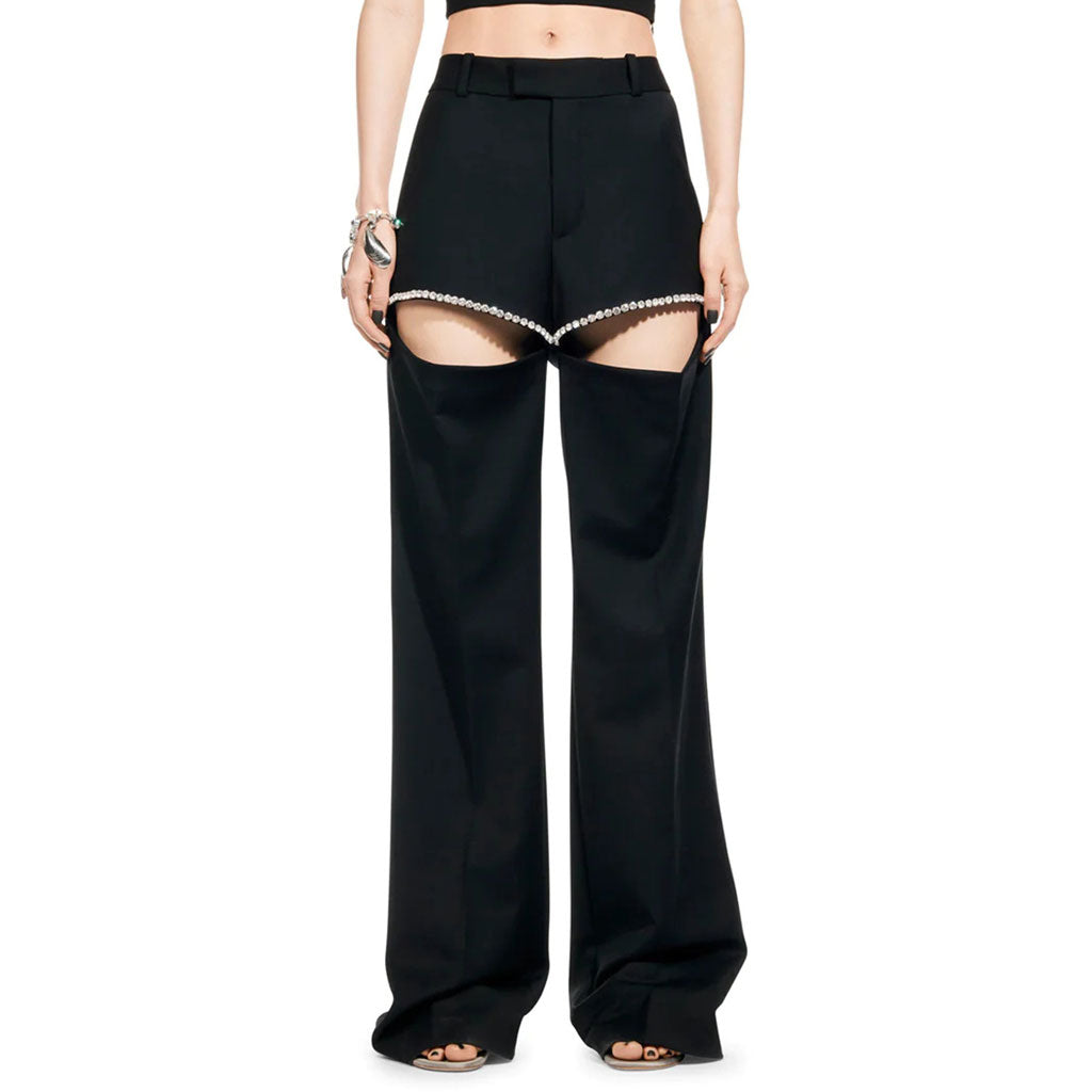 ¡Renueva tu vestuario de trabajo con nuestros exquisitos pantalones de traje de diseñador! Este pantalón casual luce elegantes cortes en los muslos adornados con brillantes pedrería, realzando el look general. El corte ancho garantiza una silueta favorecedora, mientras que el discreto cierre de corchetes y la bragueta con cremallera añaden un toque de sofisticación. La joya de la corona es la cintura alta con elegantes trabillas, que lo convierten en un complemento impactante para tu atuendo de oficina. ¡Demuestra tu estilo y sofisticación con estos pantalones brillantes que irradian una vibra inigualable!