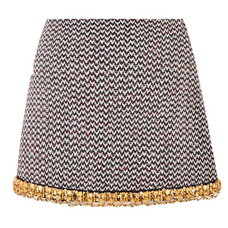 Luce con estilo con esta exuberante minifalda de tweed de cintura alta. Su corte ajustado se adapta a tus curvas a la perfección, lo que la convierte en una prenda ideal para cualquier ocasión. Su bajo corto está profusamente adornado con cristales, cuentas y lentejuelas doradas, que le dan un toque de brillo a tus pasos. Perfecta para quienes aman el brillo y no temen mostrarlo. Esta minifalda de diseñador de invierno es la prenda estrella en la colección de cualquier fashionista. Combina a la perfección con nuestra chaqueta de tweed multicolor .