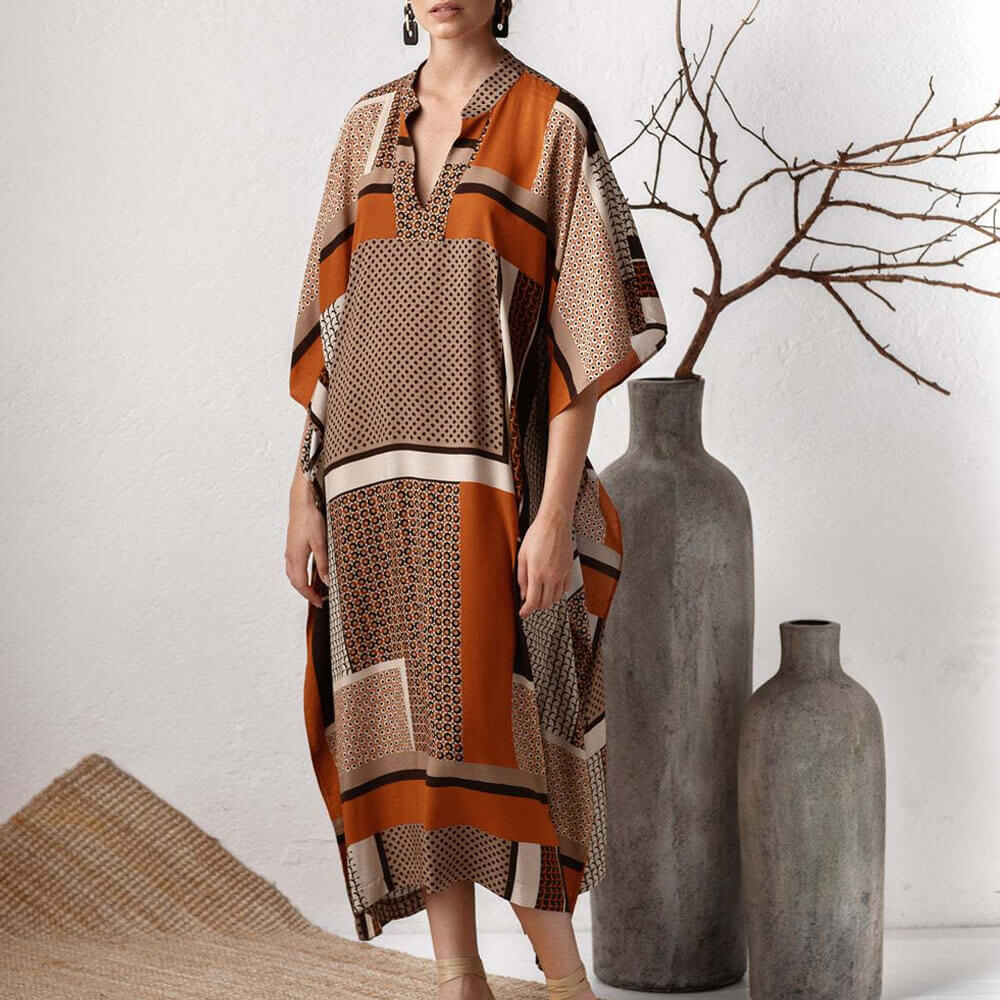 Tendencias bohemias con estilo patchwork. Este pareo brasileño tiene escote pronunciado, mangas murciélago y puños acampanados. Silueta sin forma con aberturas laterales y largo maxi.