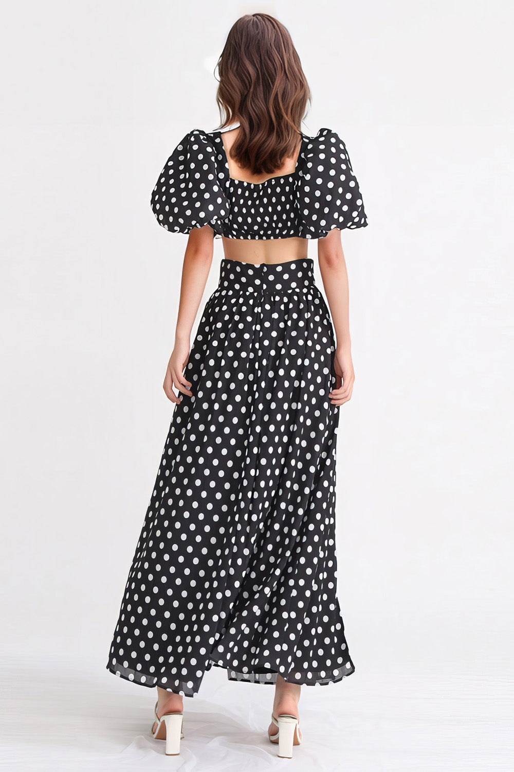 Este ligero conjunto de dos piezas de lunares es perfecto para cualquier ocasión. La blusa tiene mangas abullonadas y espalda elástica para un ajuste cómodo. La falda midi es recta y tiene cremallera en la espalda.