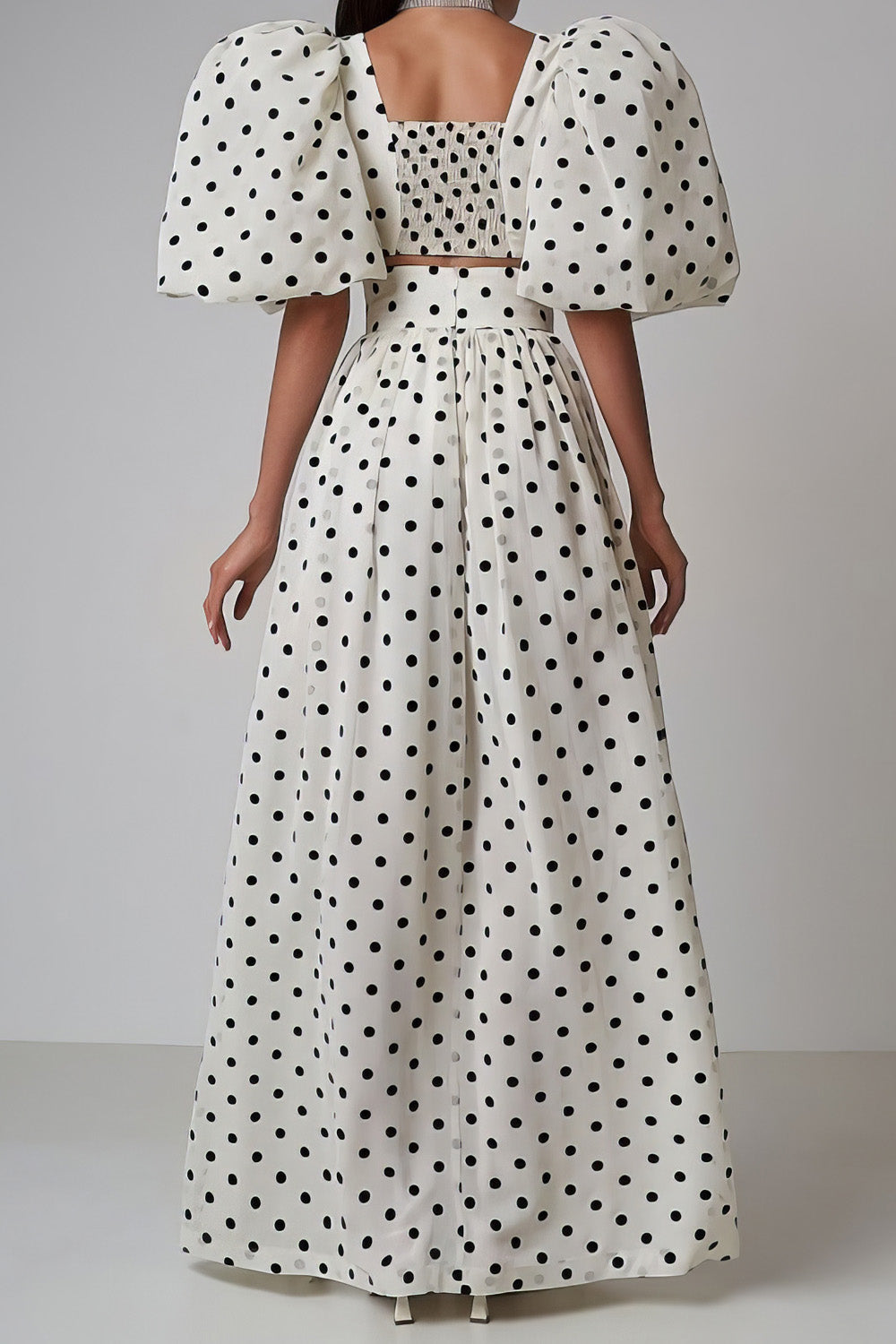 Este ligero conjunto de dos piezas de lunares es perfecto para cualquier ocasión. La blusa tiene mangas abullonadas y espalda elástica para un ajuste cómodo. La falda midi es recta y tiene cremallera en la espalda.