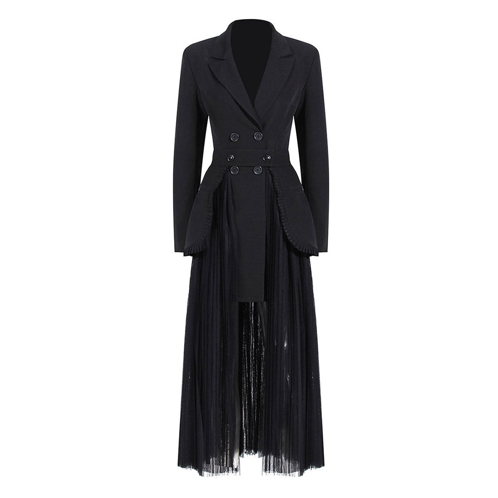 Con este modelo, seguro que sacarás el máximo provecho de tu inversión. Este conjunto negro apuesta por lo seguro con la silueta de blazer a medida, formada por un elegante cuello de solapa, mangas largas cruzadas con tapeta y hombreras. El largo mini hasta el muslo del blazer combina a la perfección con la falda de tul envolvente que deja ver las piernas. La falda a juego tiene un diseño de talle alto con cierre de botones en la parte delantera y está decorada con bolsillos laterales falsos con pequeños volantes para un look elegante. Para el trabajo, combina el blazer con unas botas elegantes, o incluso sobre un jersey de cuello alto; luego, simplemente cambia la parte inferior por la falda de tul a juego y ponte unos tacones para tu salida nocturna.