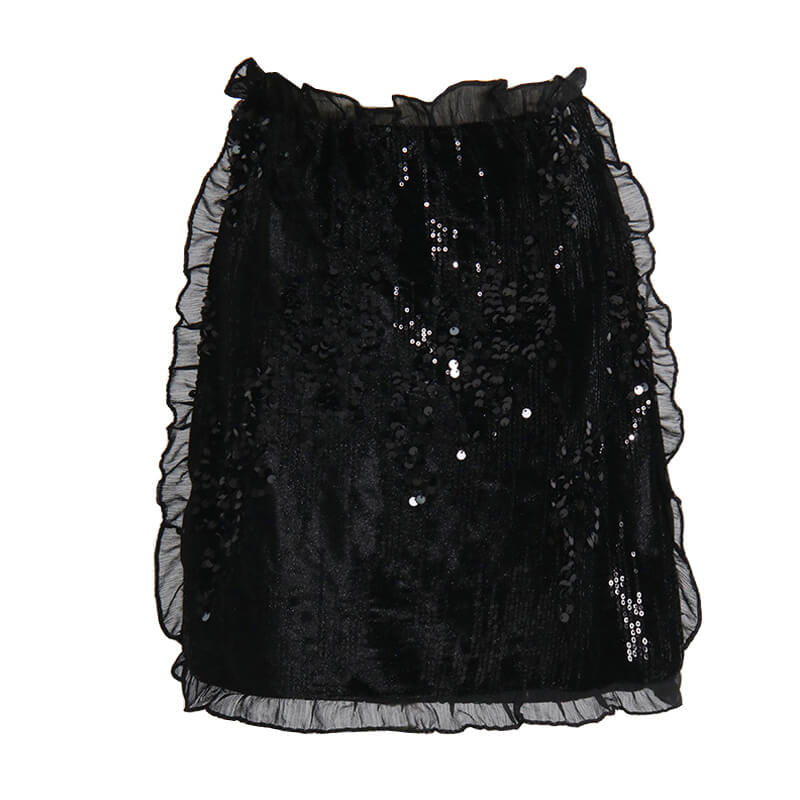 Cuanto más brillante, mejor. El adorno de lentejuelas por toda la prenda añade interés visual y un efecto favorecedor. Esta falda de diseñador está meticulosamente confeccionada con delicados volantes que le dan un toque de estilo a tu look. Se cierra con una cremallera para mayor seguridad. Su corte en capas deja el mini dobladillo al descubierto. Ligera y súper favorecedora, esta falda única es ideal para el trabajo o cualquier ocasión. Combínala con una blusa blanca y tacones.