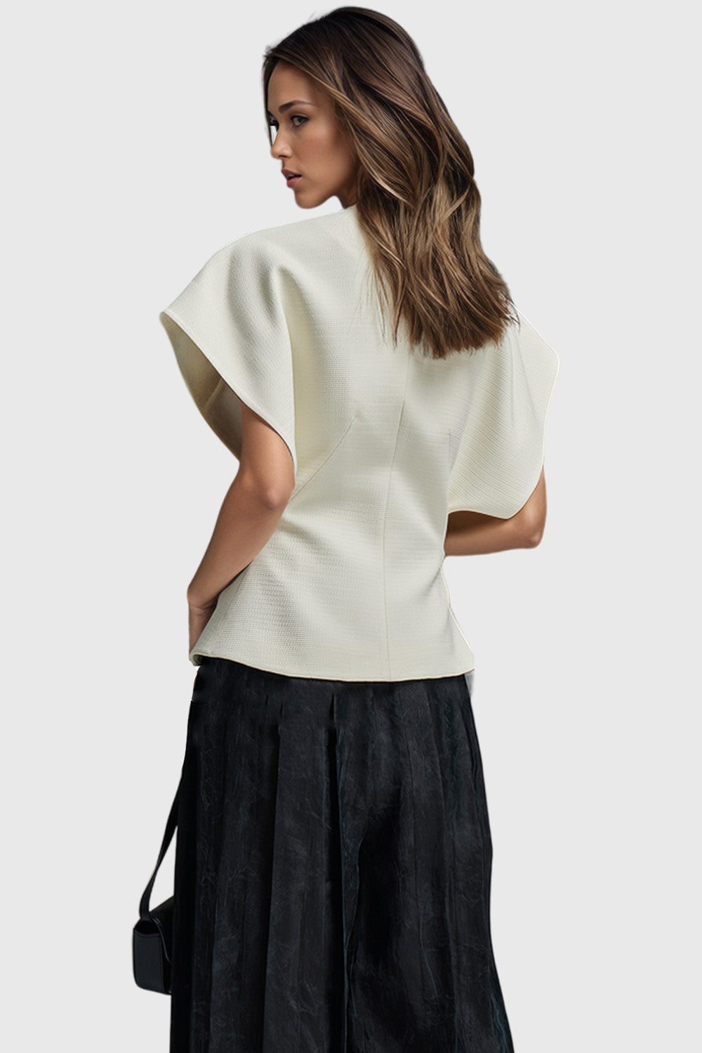 Este chaleco está confeccionado en tela suave y presenta un cierre irregular y mangas cortas. Además, cuenta con un botón y cintura arqueada para un look sutilmente elegante. Disfruta de la comodidad y la moda de este chaleco único.