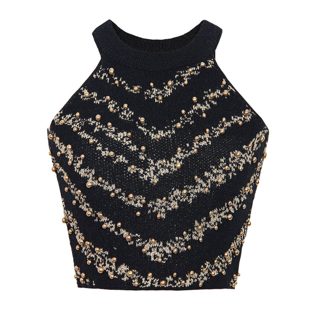 Irradia una luminosidad natural con nuestro exquisito top sin mangas de diseñador, adornado con un brillo cautivador. El escote redondo sin cordones transmite una sensación de comodidad y soltura. Las rayas de lúrex Charon en un tono contrastante realzan el encanto del top, captando todas las miradas con su estilo moderno. Los opulentos detalles de cuentas doradas le otorgan un aire de elegancia. Con su bajo corto, esta obra maestra de punto combina estilo y versatilidad a la perfección, convirtiéndola en la personificación del glamour tanto para ocasiones informales como elegantes. ¡Combínala sin esfuerzo con nuestra lujosa falda y chaqueta de punto de tweed!