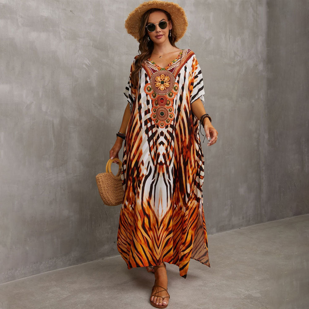 Comienza tu aventura playera con confianza este verano con nuestro elegante caftán. Con un favorecedor escote en V y mangas cortas y frescas, combina elegancia y comodidad a la perfección. Confeccionado en una suave mezcla de algodón, es perfecto para todas tus aventuras playeras. Elige entre nuestra gama de llamativos estampados, cada uno con su encanto único. Ya sea que te gusten los vibrantes estampados florales, los originales estampados geométricos o los motivos exóticos, hay un estampado que realzará tu estilo playero. ¡Un imprescindible para cualquier armario de verano!