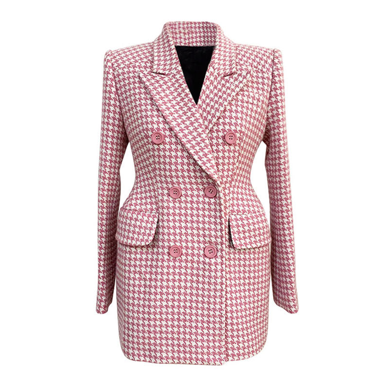 Con un toque de elegancia francesa, este blazer de invierno de nuestra colección de diseñador Otoño/Invierno vale la pena. Confeccionado con lana gruesa para protegerse del frío, este blazer blanco y rosa luce el icónico estampado de pata de gallo. Presenta hombreras, mangas largas, solapas de pico y bolsillos delanteros con solapa, lo que lo convierte en un clásico que nunca pasa de moda. Los botones tonales adornan este blazer cruzado con un toque vintage único. Combínalo con un top de punto, vaqueros y botines para un look cómodo y desenfadado de lunes a domingo.