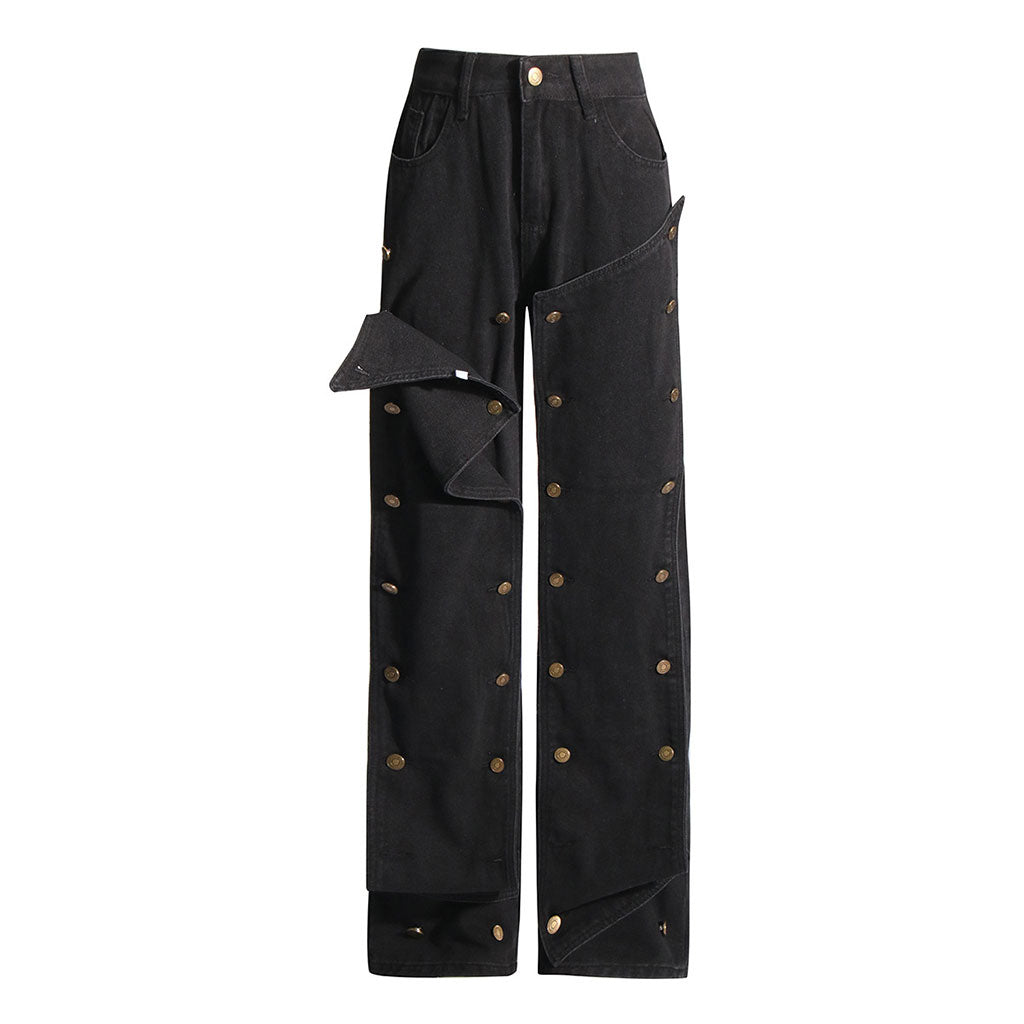 Viaja al pasado con nuestros jeans de diseñador. Un guiño nostálgico a la moda retro con un toque moderno. Lo que distingue a estos jeans retro es su diseño de capas desmontables con botones metálicos de inspiración vintage en la parte delantera, que añade un toque único y divertido a la silueta tradicional. La silueta recta ofrece un ajuste favorecedor que alarga las piernas y favorece a diversas siluetas. Ya sea para una salida nocturna con tacones o con zapatillas para un look informal de día, estos jeans únicos son tan versátiles que te acompañarán del día a la noche con facilidad.