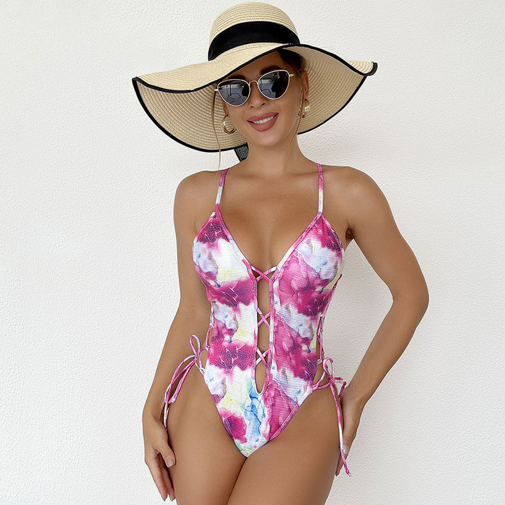 For a head-turning glam. you can have this abstract bathing suit. This dynamic one piece swimwear features a unique neck. adjustable shoulder strings. removable soft padding cups for comfort. cross-over details at the front with cutout effects. lace-up designs at the sides. and the bikini bottom has a cheeky coverage at back for a lengthening effect.
