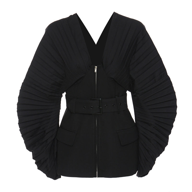 An eccentric spirit motivates LUXE's design approach with a contemporary take on your classic outerwear. Simple color with unique style. this designer jacket pulls inspiration from the classic black aesthetic using all the architectural elements. The V-neck jacket is shaped for a fitted silhouette with the detachable belt. front pockets and a zip-up fastening. The exaggerated ballooned sleeves are filled with fun pleats that speak to the designer label's penchant architectural motifs. The key to tap into '90s nostalgia is by opting for a pencil skirt and heels.