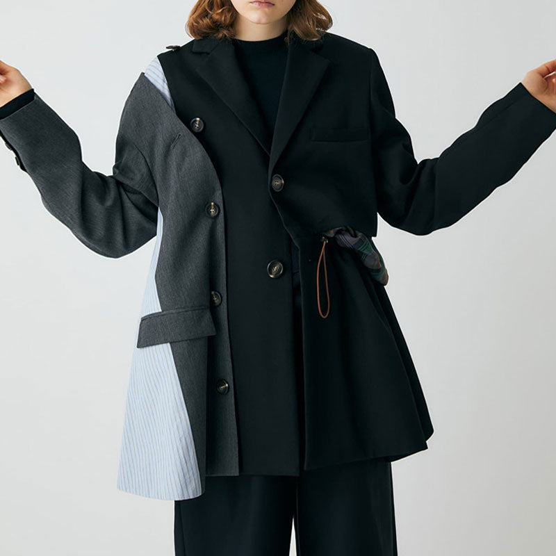 It's the deconstructed jacket that is created for a modern wardrobe addition with a sense of uniqueness. Featuring multiple panel design. the single-breasted outerwear plays up with contrasting fibers to create juxtaposition. It has a flap pocket on one side along with a row of buttons adding more details to the piece while the drawstring waist on the other side is designed with a cord stopper and a plaid shirt panel for a cinched cutout effect. The bold and creative jacket is hard not to notice. Define your own fashion game by pairing with a black skirt and ankle boots.