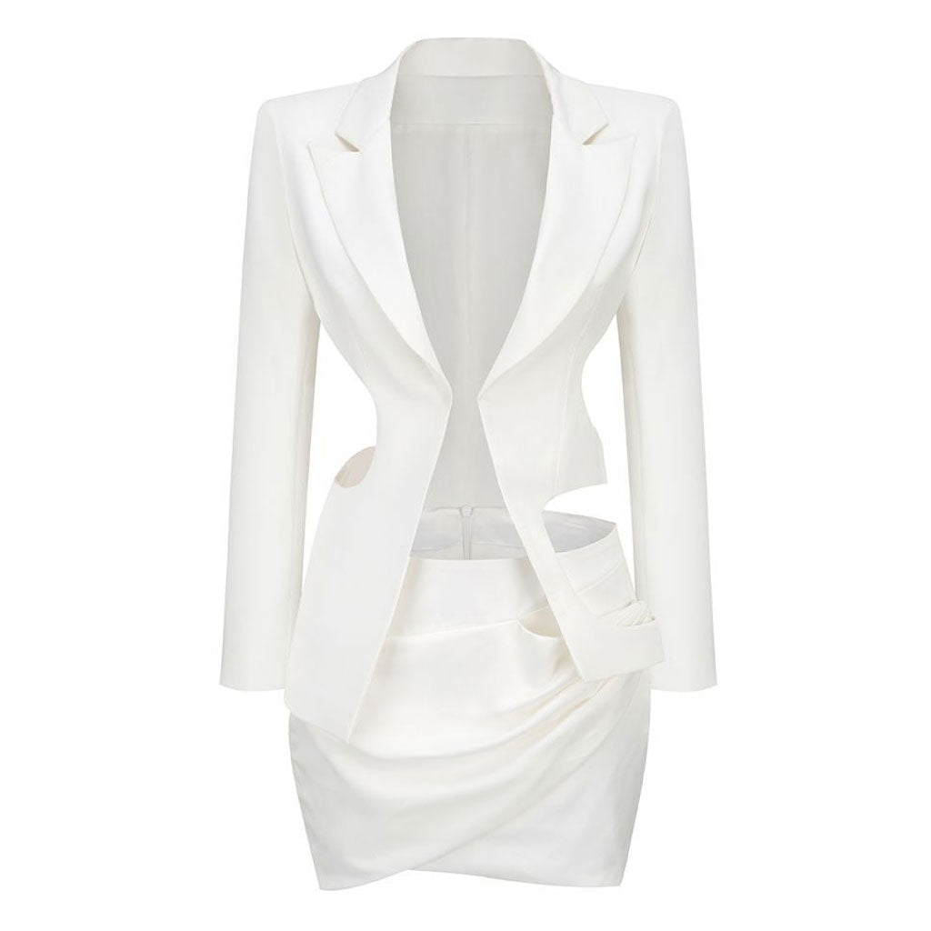 Unlike the usual blazer in your wardrobe. this two-piece blazer set is truly a classic cool aesthetic that you must have. The open-front blazer takes an asymmetrical silhouette with the high-low hemline and is distinguished with the chic cut-outs at the waist to give you a unique edgy twist. The lapel collars. shoulder pads. long sleeves and split cuffs make for a classic blazer silhouette that we all admire. The designer blazer is cut in a tailored fit that's enhanced by the rear slit hem. making it possible to fit your figure perfectly. The wrap-effect skirt shares a low-waist cut featuring the chic ruched detailing and is finished with the rear zip fastening. Having this white blazer combo. you've got all the fashionable features of a classic blazer set but with a fresh contemporary update!