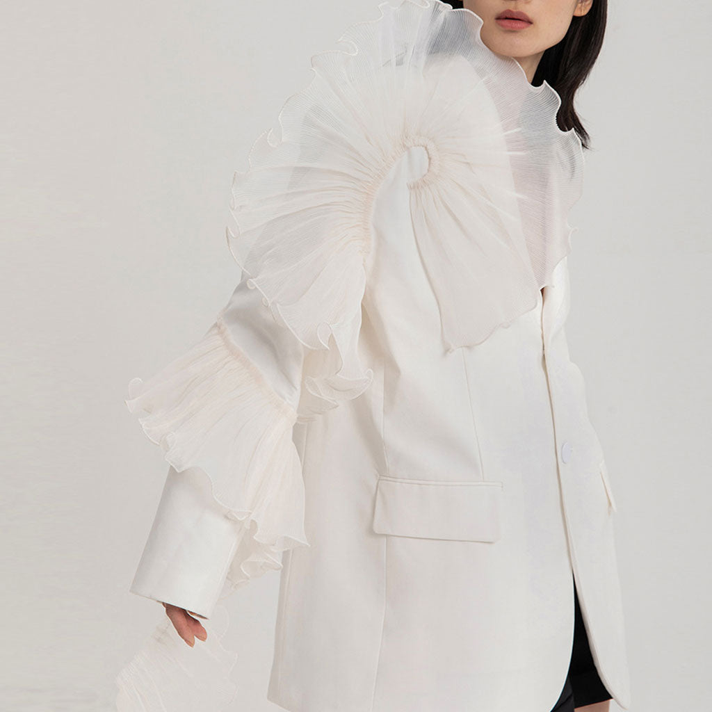 We can always count on this blazer to serve up your edgy appearance. We love the combination of an oversized. comfortable fit with the exaggerated ruffle detail tracing along the chest and arm for the attention-grabbing spiralling effect. Versatile and with the ability to transcend seasons. the white crepe blazer features a lapel collar. single-breasted placket and flap front pockets. As for styling the crisp blazer. one surefire way is to make the blazer and shorts as a combo. Don't forget to add heels and your ensemble will feel instantly pulled together.