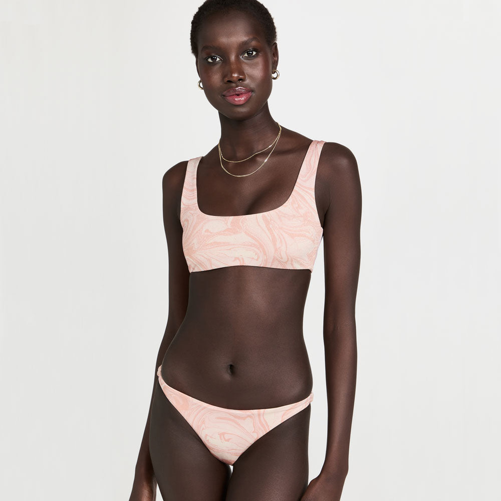 This functional cropped length bikini set in tie-dye pattern lends a sporty Spice to your beach days in summer. The Brazilian two piece swimsuit features a scoop neck swim top with removable soft padding cups for comfort. elasticated wide shoulder straps for strong support. a stretchy band to fit over the bust. and the matching low rise bikini bottom has cheeky coverage back. In summer. athletic is the best route.