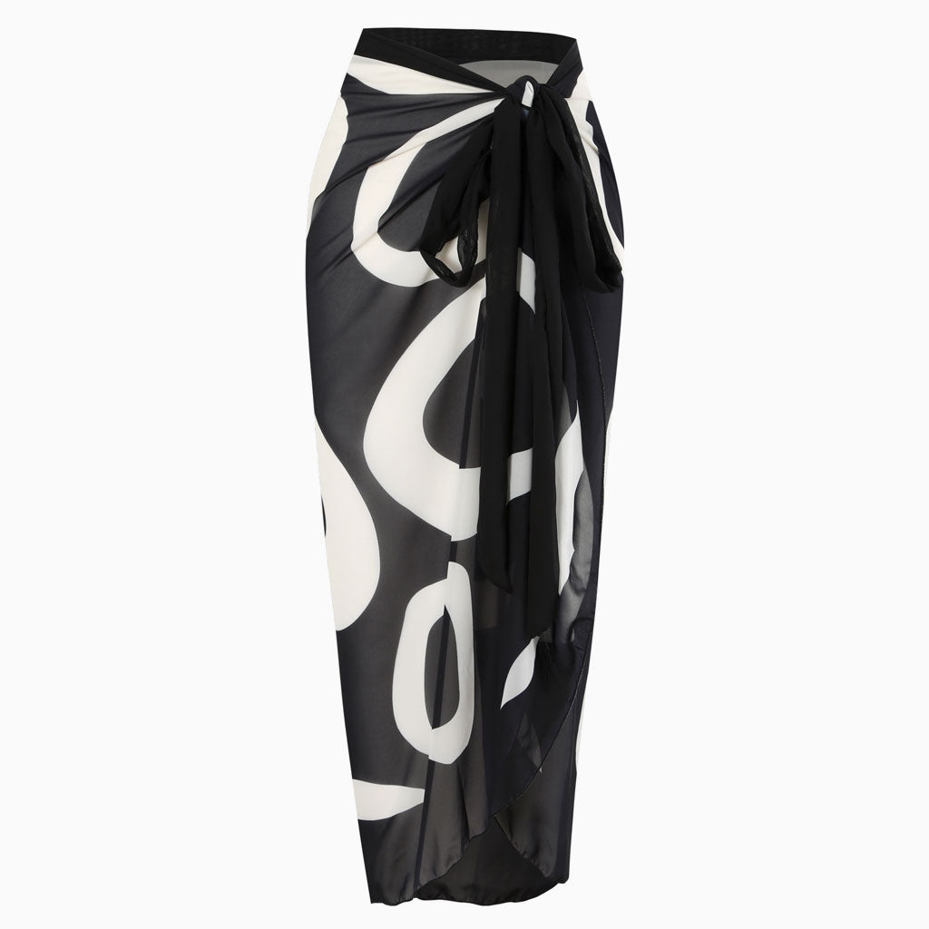 With its classic black and white wave print. this long designer cover-up exudes timeless elegance. The high-waisted silhouette is accentuated by a charming bow-tie detail. adding a touch of femininity to your beach ensemble. Crafted from lightweight chiffon. it effortlessly drapes over your figure. providing both coverage and style. Whether you're lounging by the pool or strolling along the shore. this maxi wrap sarong is the perfect companion for a stylish day under the sun.