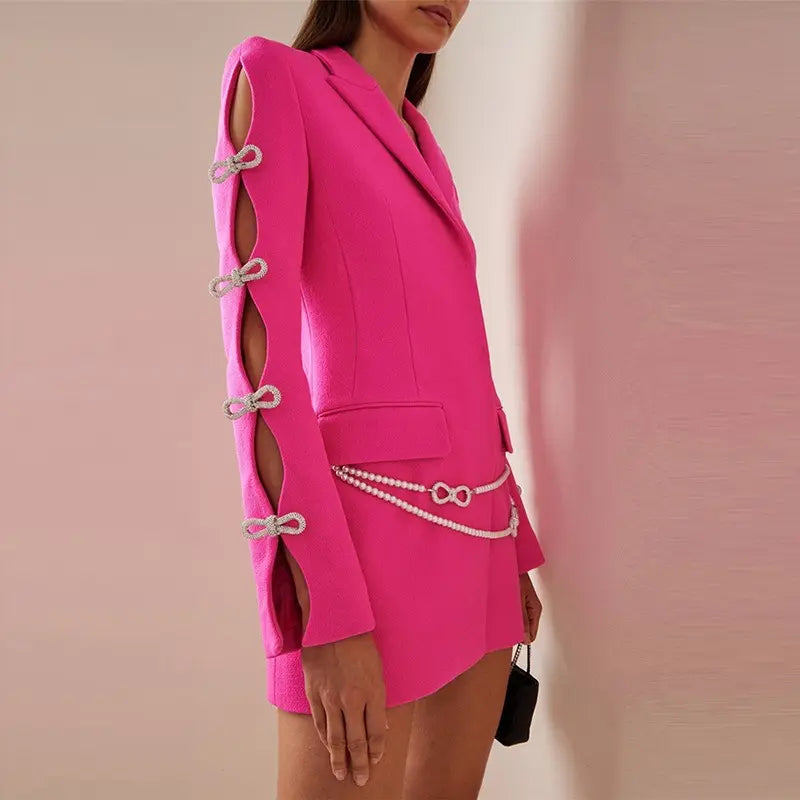 This blazer dress features a collar. sleeve cuts with rhinestone bows. and a pearls belt. Crafted from quality fabric. this dress is designed to give you a regular fit.