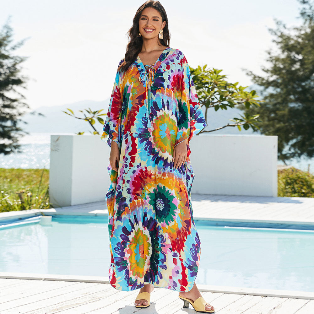 Breezy boho vibes come alive with our vibrantly printed cover up. boasting charming patterns and kimono sleeves. Inspired by Brazilian style. it offers a delightful array of options including multicolored floral. purple tie-dye floral. red floral. classic black and white floral. and fierce leopard prints. Whether you're lounging by the waves or strolling along the shore. this cover-up adds a touch of whimsical flair to your beach look.